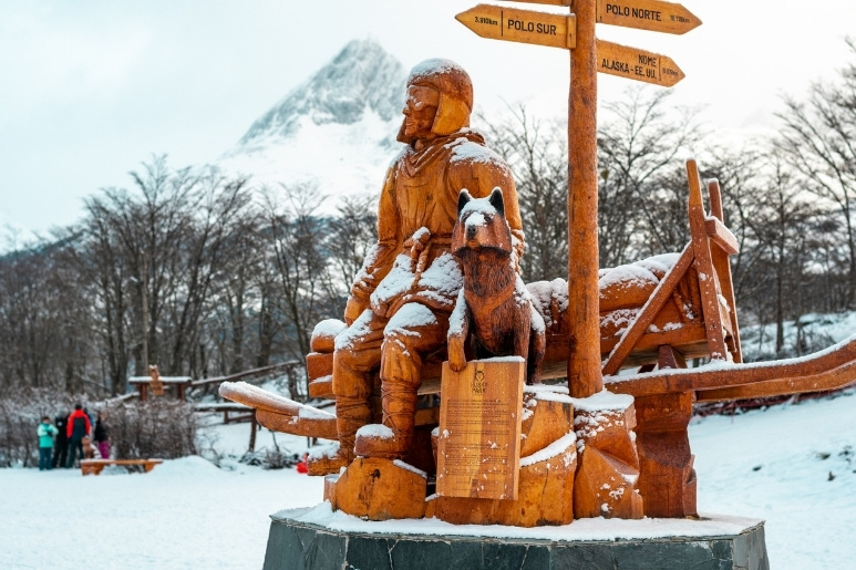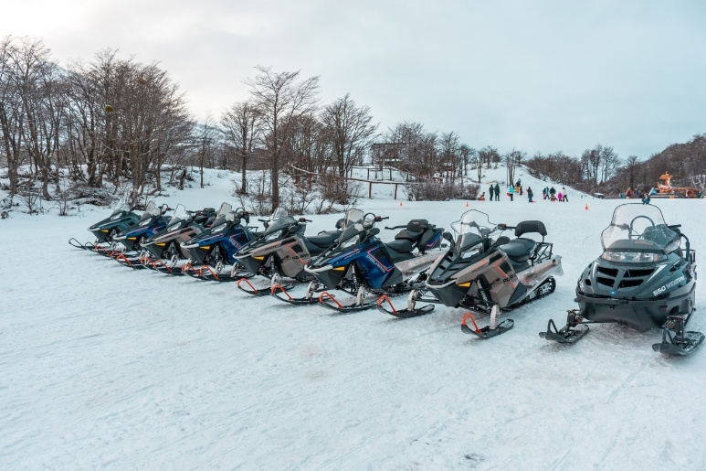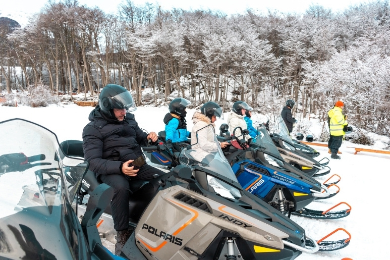 La próxima actividad es una experiencia única: el paseo en trineo tirado por Huskies de 1.5 km. El trayecto atraviesa bosques de lengas y senderos de antiguos leñadores hasta alcanzar una planicie nevada donde se dispone de tiempo para fotografías. Luego, realizaremos un recorrido de 5 km en moto de nieve biplaza, siguiendo las instrucciones y la ruta marcada por el guía.